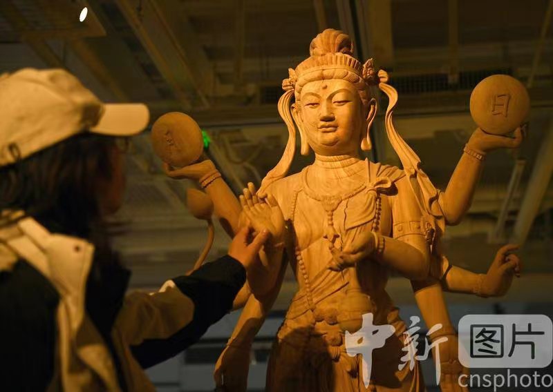 45岁的浙江宁波籍木雕艺术家季茂杰,在学习传统浙派木雕技艺的同时,又学习了西方雕塑、日本木雕等技艺,领悟到了不同文化对技艺和创作风格的影响。2012年,季茂杰来到敦煌潜心创作传承敦煌木雕艺术。他用刻刀将敦煌壁画中的平面形象“搬”出,转化为一尊尊惟妙惟肖的立体雕像。 中新社记者 李亚龙 摄