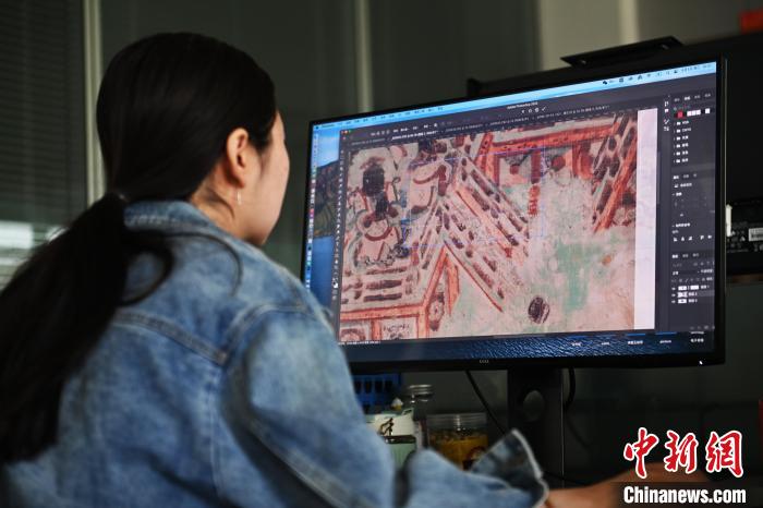 6月5日,甘肃省敦煌市,敦煌研究院文物数字化研究所科研楼内,工作人员进行数字化图像拼接处理。李亚龙 摄