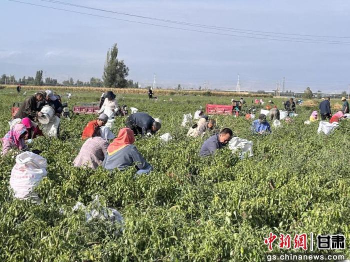 中新网甘肃新闻10月22日电 (李金业)金秋时节的凉州大地,处处涌动着丰收的热潮。在凉州区下双镇蓄水村千亩辣椒种植基地,连片的辣椒田铺至天际,一串串饱满鲜红的辣椒挂满枝头,在秋阳映照下熠熠生辉;发放镇王家墩村的田间地头,农户们分工明确、协作有序,采收、打包、装运的繁忙身影点缀其间;在双城镇辣椒种植基地,火红的辣椒“映红”了一张张喜悦的笑脸。这蓬勃生长的“红色果实”,正是武威市凉州区立足地域特色、推动乡村产业振兴的生动注脚。