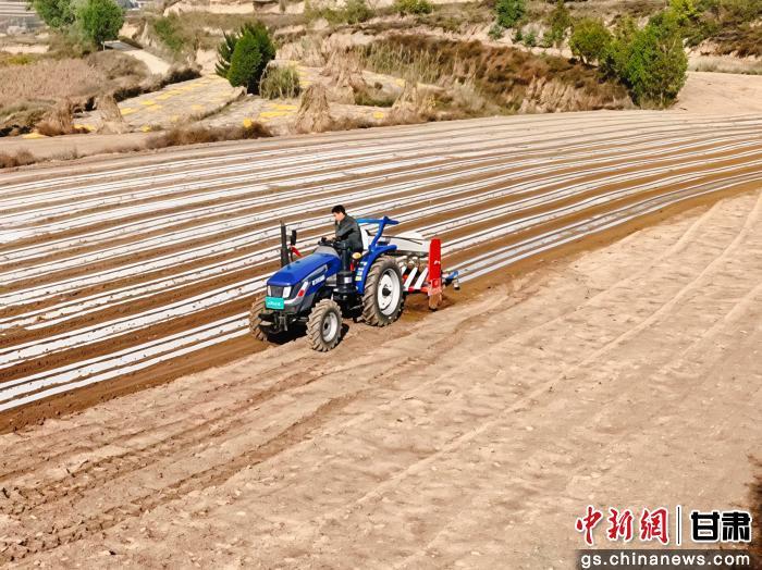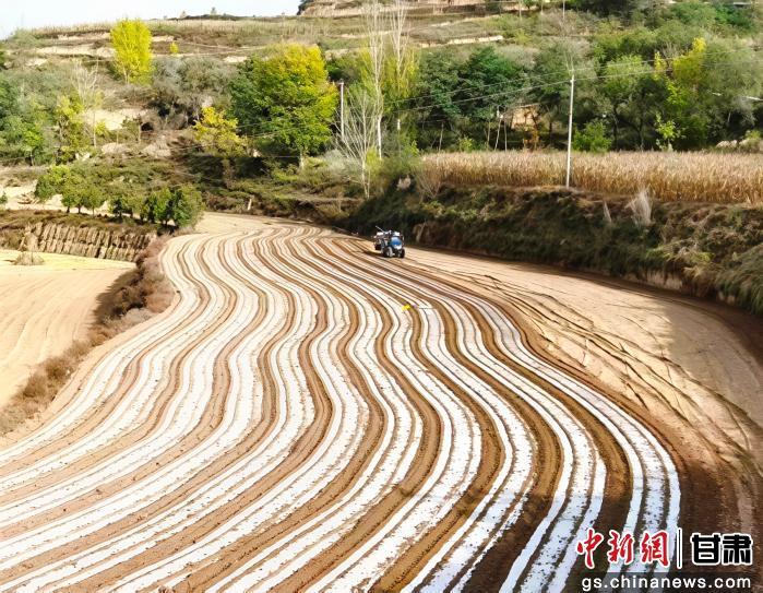 中新网甘肃新闻10月31日电(孙锦丽)深秋时节,黄土高原的寒意渐浓,但在平凉市静宁县灵芝乡尹岔至东庄流域2万亩粮食生产示范带里,却呈现出一派热火朝天的景象。旋耕机翻整土地的轰鸣声与覆膜机的穿梭作业声交织,层层梯田披上银装,一道道覆好的地膜在阳光下泛着粼粼波光,为来年春播筑起“保墒屏障”。