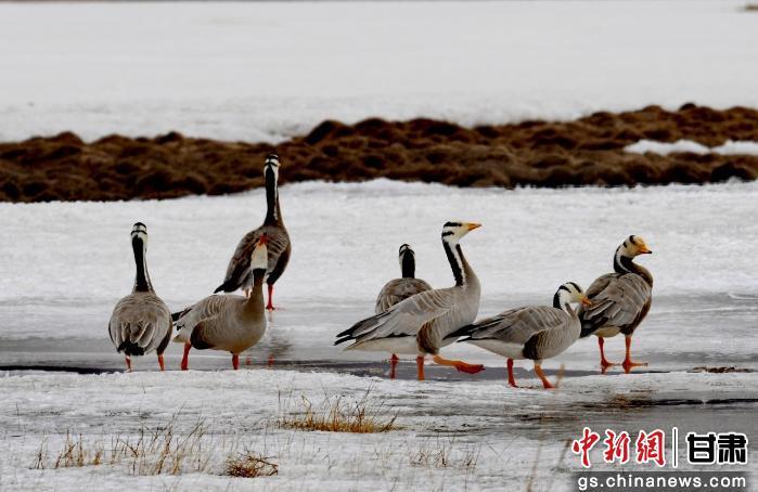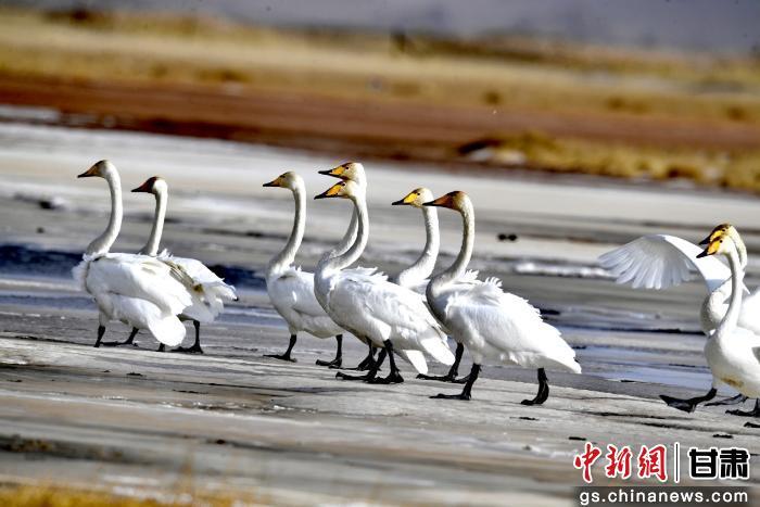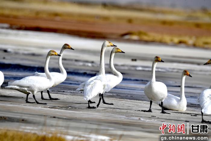 图为在甘肃盐池湾国家级自然保护区内,斑头雁、大天鹅、反嘴鹬等珍稀鸟类在湿地水域间游弋觅食、振翅翱翔,为深秋的高原湿地增添了灵动生机。 色拥军 摄