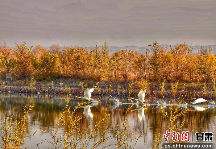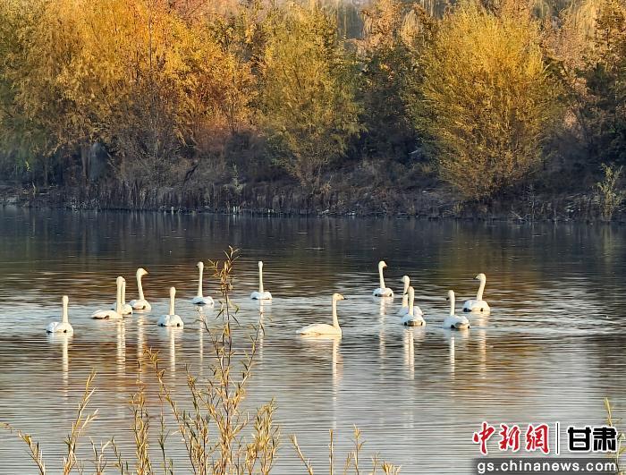 中新网甘肃新闻11月12日电 (段海 雷景韬)立冬甫过,寒意初显,张掖黑河湿地国家级自然保护区高台段迎来了一年中最富诗意的时节——数百只大天鹅如约从西伯利亚振翅南来,将这片广袤湿地装点成优雅灵动的“天鹅湖”。这群“白色精灵”时而引颈高歌,时而掠过如镜水面,在金色芦苇丛中翩跹起舞,构成一幅生机盎然的生态画卷。