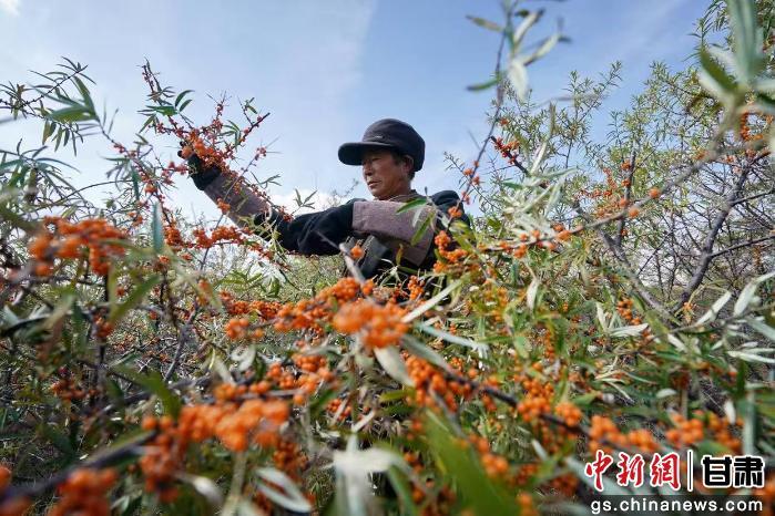 中新网甘肃新闻11月12日电 (后爱萍)每到沙棘成熟的时节,定西市漳县的群山便被一抹耀眼的金色点亮。漫山遍野的沙棘树缀满沉甸甸的果实,在枝叶间折射出璀璨光泽,一幅丰收盛景在天地间铺展,令人心醉神迷。这片郁郁葱葱的沙棘林总面积达30万亩,其中挂果面积25万亩,厚重的生态基底让漳县当之无愧加冕“中国沙棘之乡”的美誉。