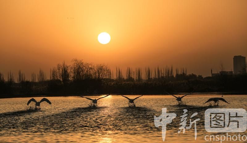 2025年11月15日,一群大天鹅在红日映照下的甘肃省张掖市国家湿地公园湖水中悠闲栖息。冬日清晨,初升的红日映照在甘肃省张掖市国家湿地公园,将湖水渲染成一片红色,成群的大天鹅在宽阔的湖水中或悠闲栖息觅食,或展翅飞翔,沉寂的湿地公园呈现出一片暖意融融的欢腾景象。中新社发 陈礼 摄