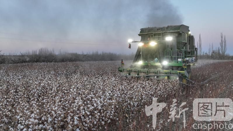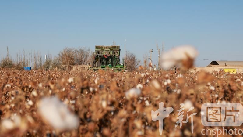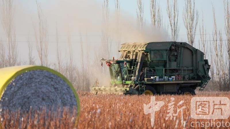 2025年11月15日,甘肃省酒泉市金塔县金塔镇一农场,采棉机在棉田里来回穿梭,忙着采收棉花。