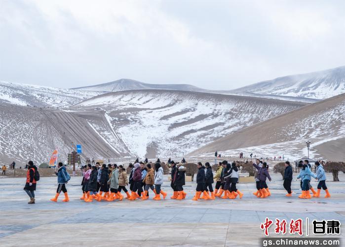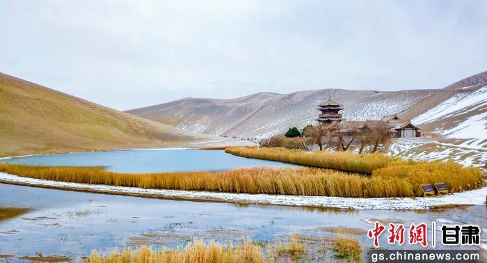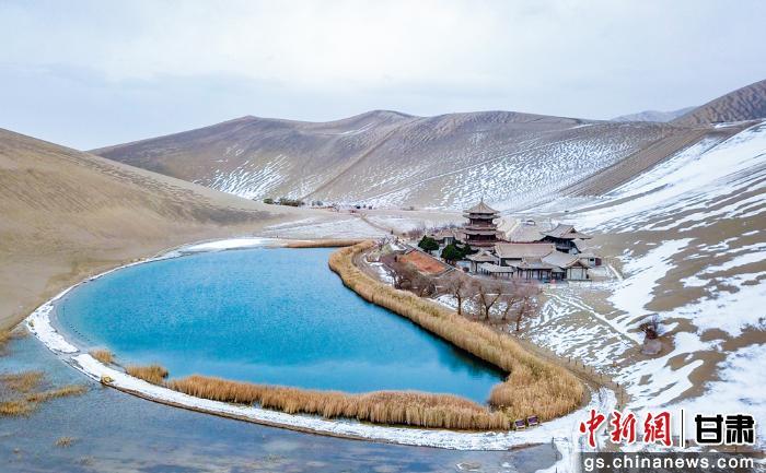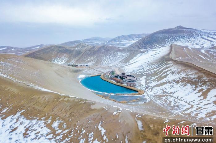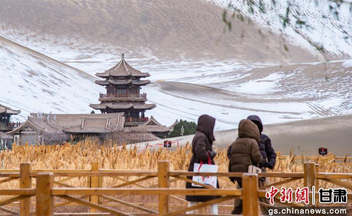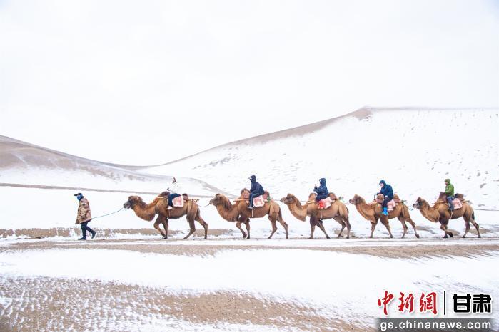 11月23日,甘肃省敦煌市迎来初冬的第一场降雪。敦煌鸣沙山月牙泉景区被皑皑白雪覆盖,沙雪交融,驼铃叮当,景色如画。(王斌银 周玉玲)