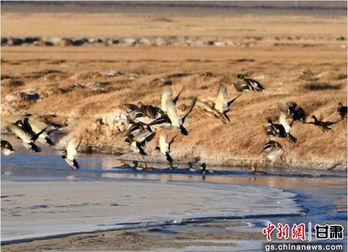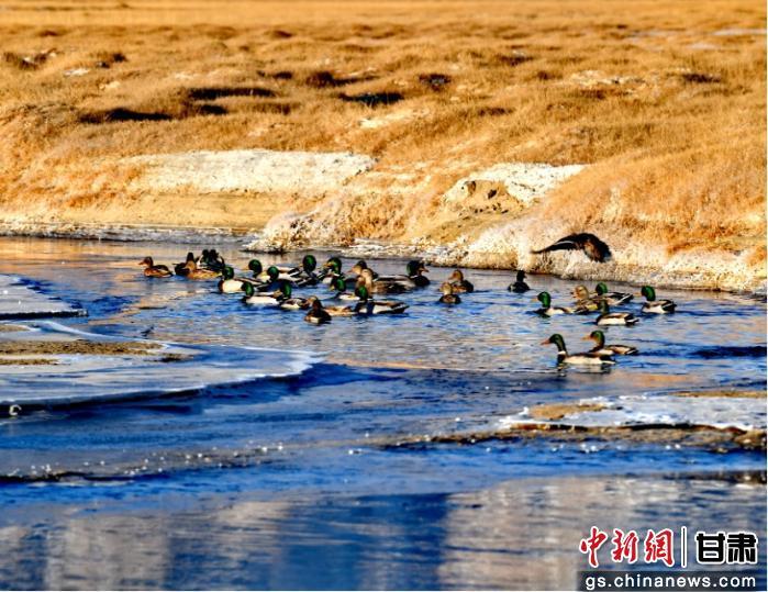中新网甘肃新闻11月28日电(张娅妮 色拥军)寒冬时节,在甘肃盐池湾国家级自然保护区内,湿地半覆薄冰,未冻的粼粼融水间,成群绿头鸭往来游弋。它们顶着标志性翠羽,或低头啄食水波里的食料,或结伴浮于水面,时而振翅掠过冰面,灵动身影划破寒寂。