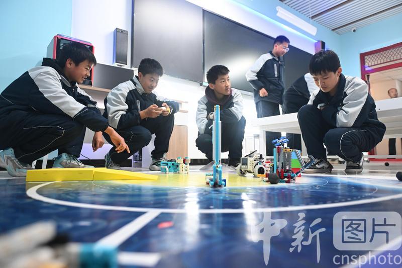 12月18日,甘肃积石山,灾后恢复重建的积石山县第五中学内,学生进行机器人编程学习。2023年12月18日,甘肃临夏州积石山县发生6.2级地震。两年来,积石山县209个纳入国家规划的灾后恢复重建项目已全面完成验收,住房、教育、产业、医疗等一批基础设施项目建成投用,标志着甘肃积石山6.2级地震灾后恢复重建工作实现“三年任务两年完成”。中新社记者 李亚龙 摄
