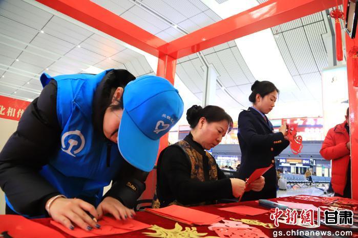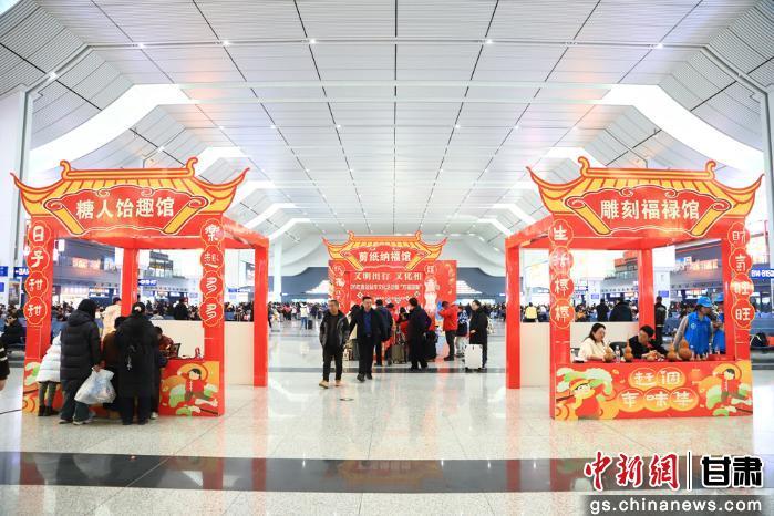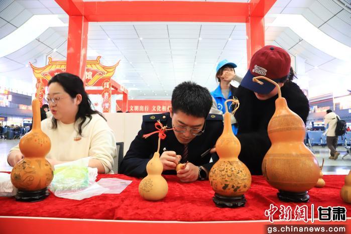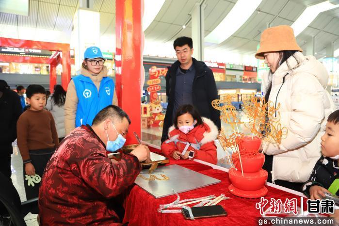 近日,中国铁路兰州局集团有限公司兰州西站候车大厅变身非遗体验空间,剪纸、微雕葫芦、写对联、糖画等陇原非遗项目集中亮相,吸引众多旅客驻足观赏、拍照打卡,不少等待乘车的旅客主动上前动手体验,在互动中感受非遗魅力与传统年味,让旅途充满年味与文化气息。据了解,中国铁路兰州局集团有限公司以非遗进车站为载体,将传统文化与出行服务融合,既丰富旅客候车体验,也传承弘扬陇原非遗,让团圆路更有温度、更具韵味。 王光辉 摄