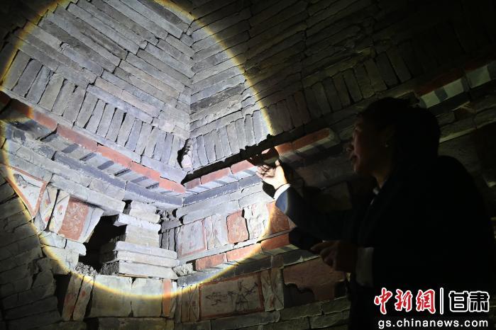 10月29日,“何以中国|壁画里的中国·当AI遇见小飞天”网络主题宣传活动走进甘肃张掖、嘉峪关,实地探访魏晋时期古墓葬群遗址,于千年壁画中感受古代河西地区各族人民的生活图景。所谓壁画砖,就是模印或刻画的有画像或花纹的砖,主要用于镶嵌和装饰墓室。从20世纪末开始,考古工作者在高台县骆驼城、许三湾遗址抢救性发掘9座魏晋墓葬,出土魏晋时代墓室画像砖400多块。这些画像砖反映出了河西地区生活、生产、军事、文化的真实情景,具有浓厚的生活气息。图为在甘肃张掖市高台县魏晋壁画墓内,工作人员向参观者介绍壁画砖所绘内容。九美旦增 摄