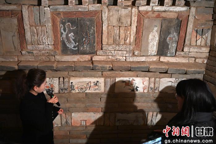 嘉峪关新城魏晋墓群该墓群分布着千余座魏晋古墓,从1972年至今已发掘18座,出土彩绘画像砖760余幅,多为一砖一画或数砖组成的连环画,素有“地下画廊”之美誉。画像砖内容多取材于当时社会现实生活,有农耕、采桑、狩猎、屯垦、驿传、出行等画面,为研究魏晋时期河西地区的社会、政治、经济、文化提供了珍贵的史料。图为在嘉峪关新城魏晋墓群六号墓内,工作人员向观众介绍壁画砖墓内部建造结构。九美旦增 摄