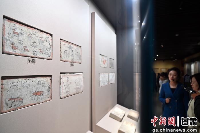 图为在甘肃张掖市高台县博物馆内,讲解员向观众介绍《牧畜图》壁画砖。九美旦增 摄