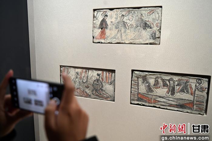 图为游客在甘肃张掖市高台县博物馆内拍摄展出的魏晋壁画砖。九美旦增 摄