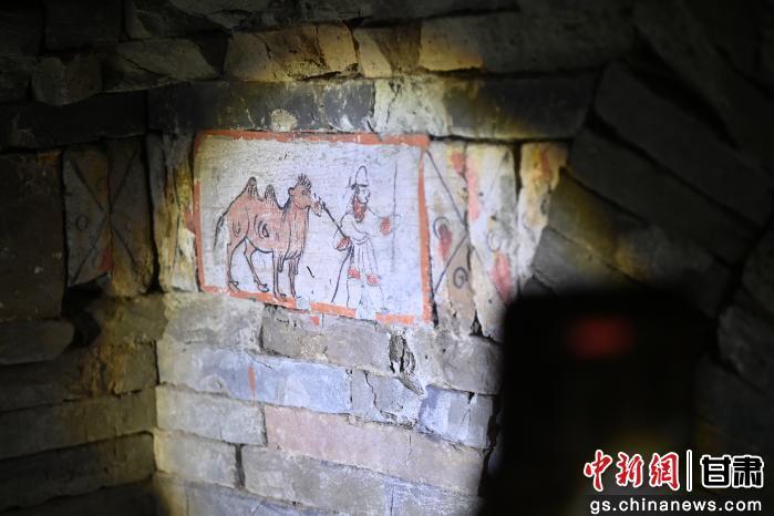 图为嘉峪关新城魏晋墓群六号墓内呈现的《牵驼图》画像砖。嘉峪关地处丝绸之路要道,《牵驼图》是中亚与西亚商人奔波于丝绸之路的真实写照,也是反映丝绸之路经贸往来的代表性文物。九美旦增 摄