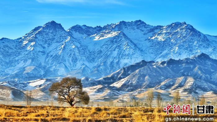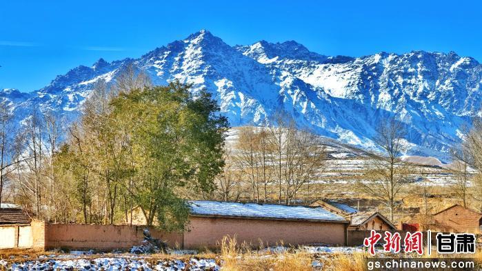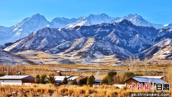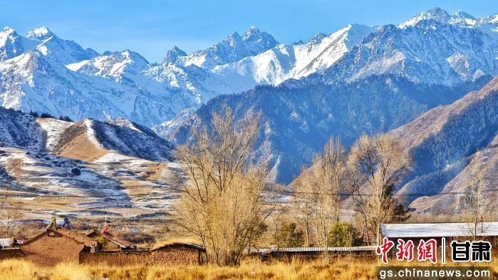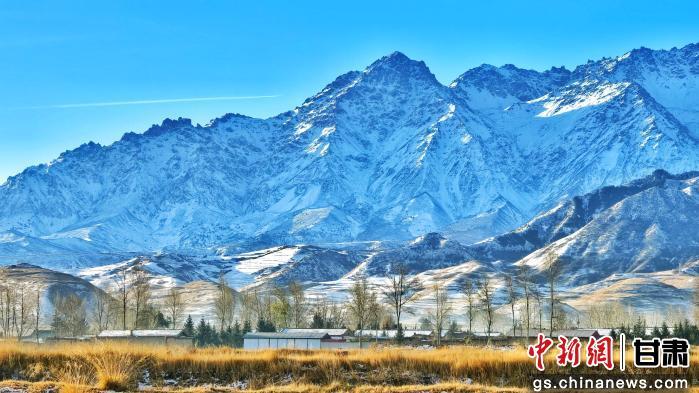 初冬时节,甘肃省张掖市民乐县妖娆多姿、风光旖旎。远处,祁连山脉巍峨矗立,山顶的皑皑白雪在澄澈蓝天的映衬下,更显圣洁雄浑。山峦层次分明,或覆雪如银,或露岩似黛,在光影交错中勾勒出硬朗的轮廓。山脚下的村落,房屋错落,树木或叶片落尽、枝丫疏朗,或仍有残叶点缀,与金黄的草地相映成趣,宛如一首无声却动人的交响,让人心生向往。王晓泾 摄