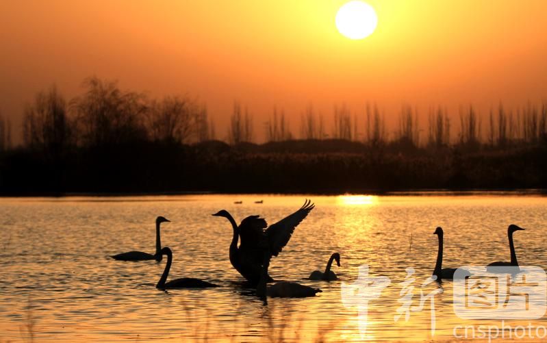 2025年11月15日,一群大天鹅在红日映照下的甘肃省张掖市国家湿地公园湖水中悠闲栖息。冬日清晨,初升的红日映照在甘肃省张掖市国家湿地公园,将湖水渲染成一片红色,成群的大天鹅在宽阔的湖水中或悠闲栖息觅食,或展翅飞翔,沉寂的湿地公园呈现出一片暖意融融的欢腾景象。中新社发 陈礼 摄