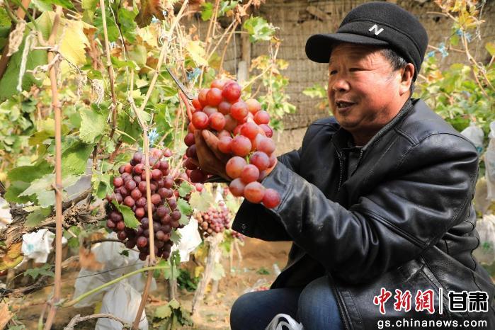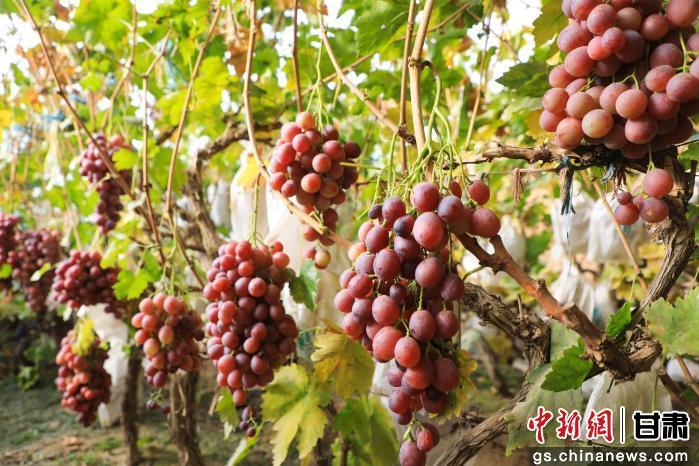 中新网甘肃新闻11月26日电 (王朝昀 王珍艳)初冬时节的民勤寒意袭人,但在该县三雷镇中雷村葡萄大棚内一派春意盎然。翠绿的藤蔓沿着架杆蜿蜒舒展,一股浓郁的果香扑鼻而来,绿油油的藤叶下挂满了一串串鲜香诱人的葡萄,让人垂涎欲滴。