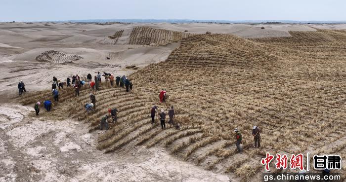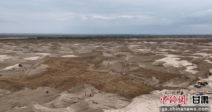 中新网甘肃新闻11月27日电(孙瑶 王翠)初冬时节,走进位于瓜州县锁阳城镇北桥子长沙岭风沙口的甘肃省酒泉市疏勒河中下游防沙治沙林草综合治理项目十八标段施工现场,5架大型无人机往来作业,操作员紧盯屏幕操控,精准吊卸150斤重的稻草墩;地面工人分工协作,将稻草深植沙土形成固沙屏障。