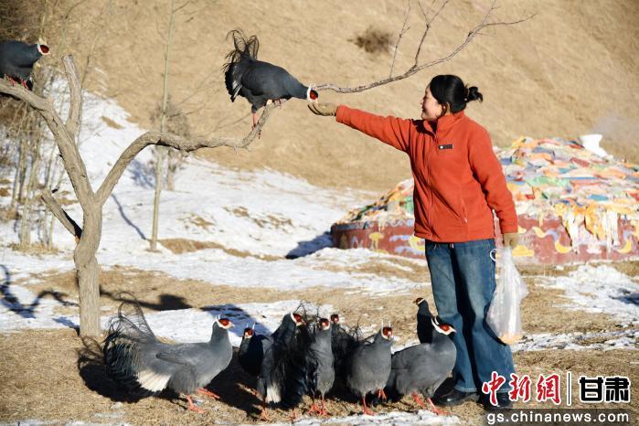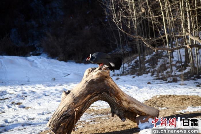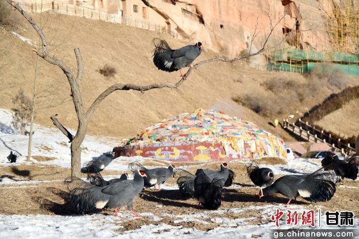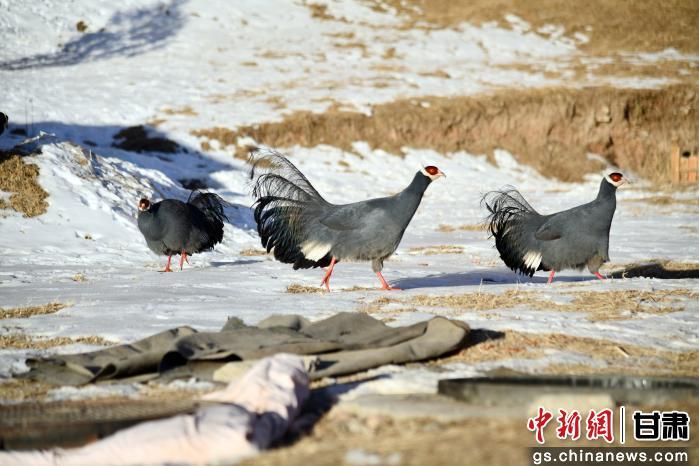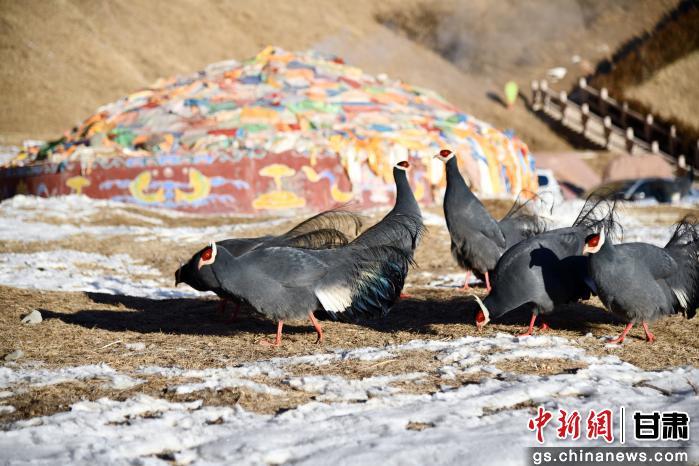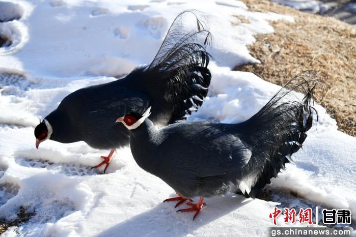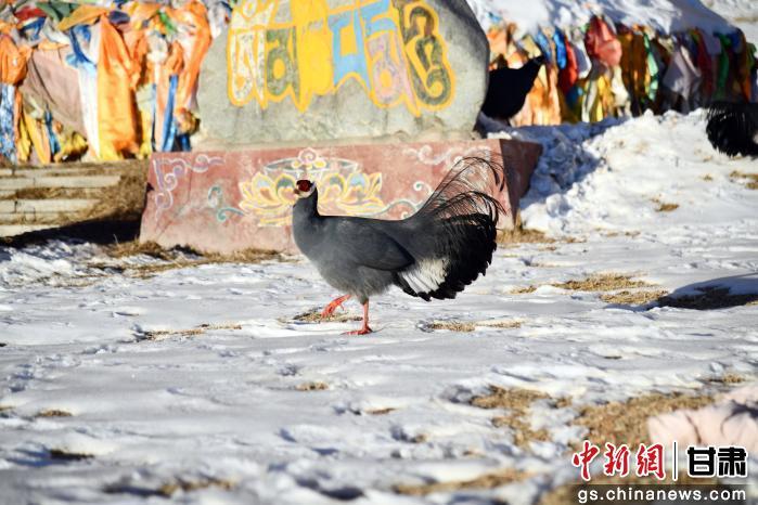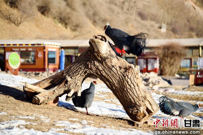 11月29日,雪后的甘肃省张掖市肃南裕固族自治县马蹄寺景区银装素裹,生态环境持续向好让蓝马鸡频繁现身,成群结队在景区内觅食嬉戏,成为冬日里一道灵动的生态风景线。