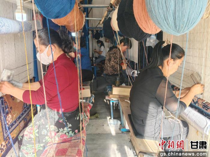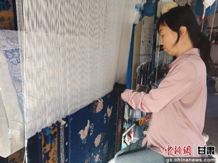 中新网甘肃新闻12月10日电 (韩土原)12月上旬,走进古浪县大靖镇的省级非遗工坊——古浪县陇原巧手传统手工制品有限公司,编织车间内一派热闹的繁忙景象,机架经纬间,女工们双手灵活,穿绳系扣、砸实剪余,一双双巧手让羊毛线在指尖飞舞间穿梭跳动,一块块兼具艺术性与实用性的手工地毯逐渐成形。