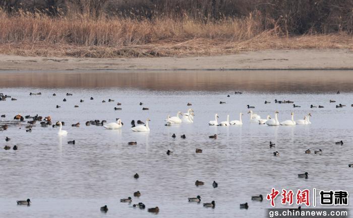 12月7日,在甘肃省酒泉市肃州区魏家湾水库,成群的天鹅、白鹭、绿头鸭、赤麻鸭等候鸟在此悠然栖息,构成了一幅人与自然和谐共生的动人图景。