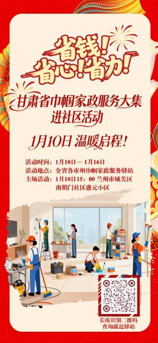 在兰州市,甘肃省妇联组织酒泉路巾帼家政服务驿站在城关区南稍门社区盛元小区开展集中活动,现场共设立了6个特色专区:家政驿站展示咨询区、家政技能互动体验区、家政数智化平台展示区、技能培训就业指导区、家政志愿服务区及年俗展示区,各个专区都设置了丰富的服务内容。(完)