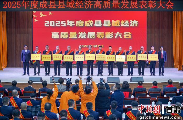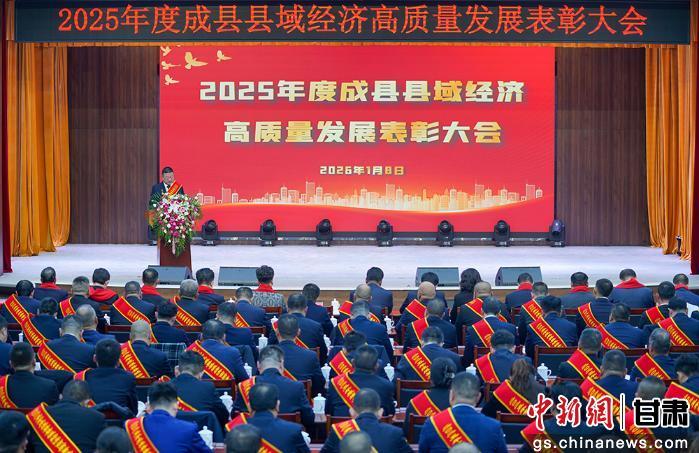 中新网甘肃新闻1月12日电 (刘建军)旌旗猎猎鼓人心,掌声雷动敬功臣。近日,陇南市成县举行2025年县域经济社会高质量发展表彰大会,对过去一年在各条战线上做出突出贡献的30个先进集体和100名先进个人进行表彰,以最庄重的方式礼赞实干、致敬担当,在全县树立起崇尚先进、奋发进取的鲜明导向。