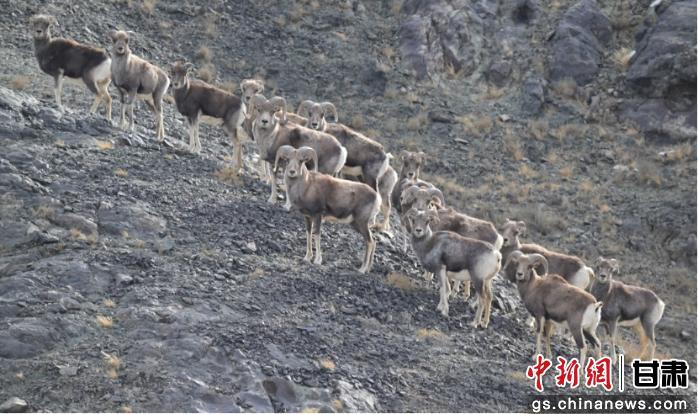 在保护区砾石山坡间,戈壁盘羊成群结队觅食、迁徙,种群规模少则十余只,多则二十余只,集群活动的壮观场面被清晰记录。同时,巡护监测中还发现了其他珍稀野生动物活动踪迹,印证着马鬃山地区生态环境的持续改善。