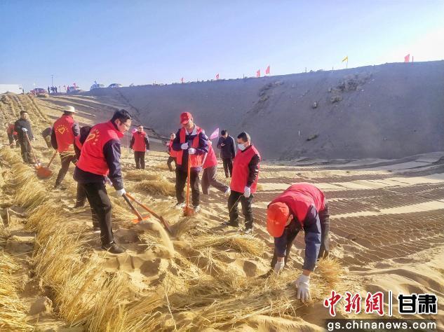 春回凉州,不仅是绿意萌动的时节,更是向沙漠进军的号角。在凉州区九墩滩光伏治沙示范园区集中压沙现场,连绵起伏的沙丘上党旗飘扬,人头攒动。参与义务压沙的志愿者分工协作、默契配合,大家扶犁开沟、躬身铺草、挥锹压埋、填沙整型,一道道草方格纵横成网慢慢铺展开来,为广袤的沙漠增添了无限生机。