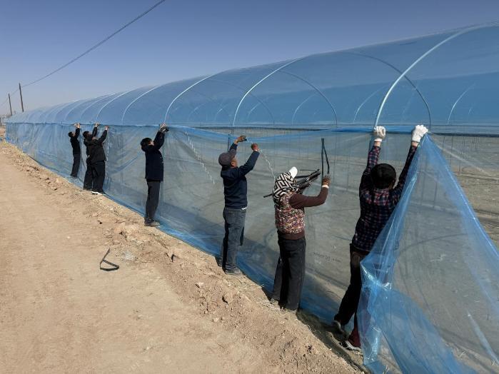 中新网甘肃新闻3月12日电 (王希丽)春和景明,实干兴农。连日来,民勤县西渠镇号顺村连体拱棚示范点建设现场一派火热,钢架林立、人影攒动,村民们分工协作,有条不紊地开展拱棚外围绑扎、细节加固等收尾工作,一座座整齐规范的连体拱棚拔地而起,为当地特色产业高质量发展筑牢根基。
