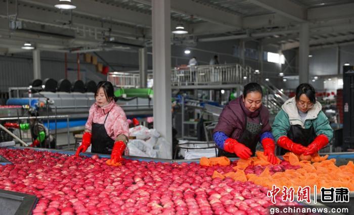 生产线上,一颗颗色泽红润、饱满圆润的秦安苹果经过清洗、分拣、分级,被工人们熟练地套网、贴标、装箱,现场一派热火朝天的景象。