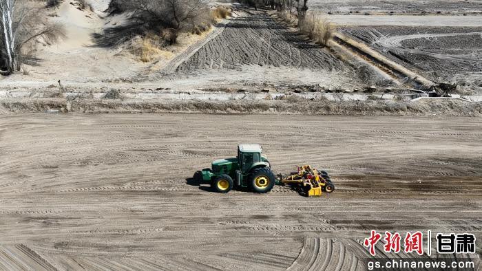 在瓜州县瓜州镇,大型农机在田地里往来穿梭,开展播种作业,翻耕、耙平、起垄等田间作业一气呵成、规范高效,为孜然套种顺利开播做好了准备。