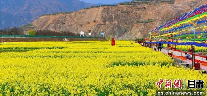 中新网甘肃新闻3月24日电 (郭玺 高江花 陈盼峰)春风拂面,春意盎然,白龙江畔万顷油菜花竞相绽放。近日,陇南市武都区角弓镇迎来油菜花海最佳观赏期,连片金黄与青山碧水相映成画,勾勒出一幅秀美灵动的陇上江南春日画卷。