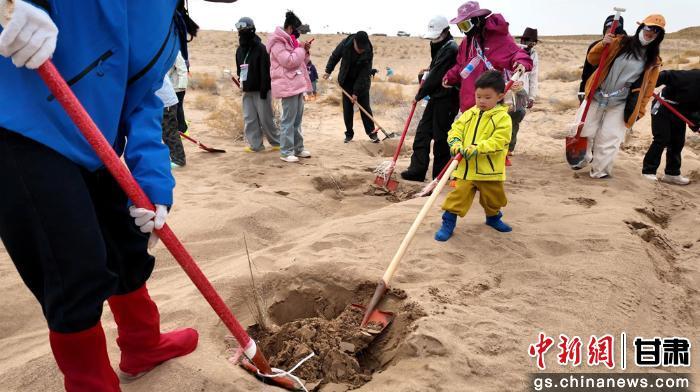 来自广西南宁的滕老师带着妻子和5岁的儿子滕轶琛,辗转2300多公里来到民勤,参加此次公益治沙活动。孩子没来过大西北,有时风吹沙子连眼睛都睁不开,但跟着队伍参加种树,一次也没落下。