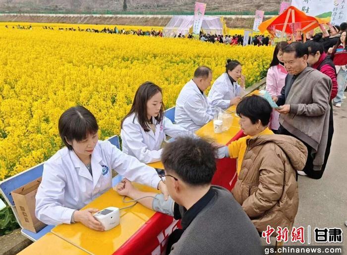 花海入口处,一个特别的“摊位”前人头攒动。来自各民主党派、区党外知识分子联谊会的医疗专家团队,正在这里开展“送医下乡”义诊活动。