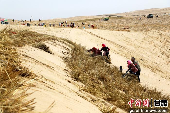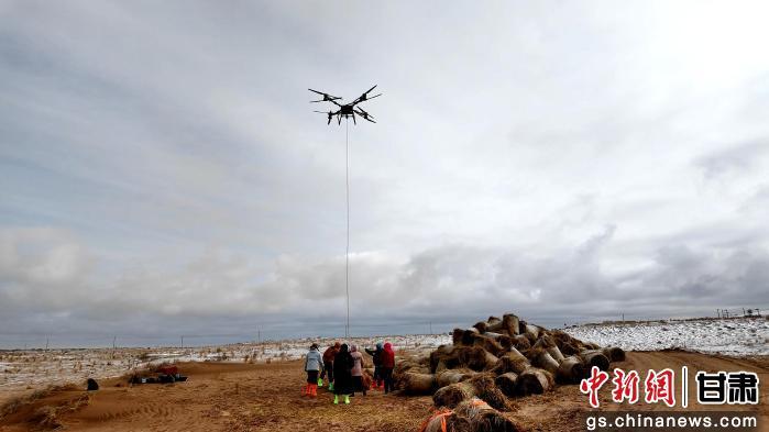 中新网甘肃新闻3月31日电 (富承璘)一场春雪过后,干燥的沙漠多了几分潮润,也让气温降到了零下,但是在民勤县新隆村压沙现场,压沙工作如火如荼地进行着,最引人注目的是两架无人机正在来回吊运稻草,帮助开展春季压沙工作。