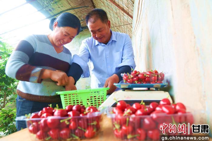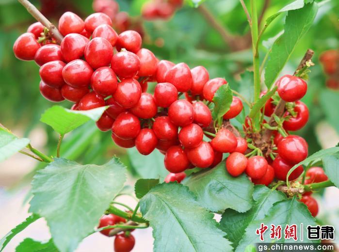 中新网甘肃新闻4月13日电(程莉)春日时节,果香四溢。张掖市临泽县板桥镇红沟村奋进专业合作社的樱桃大棚内,一派丰收盛景:翠绿枝叶间,一串串樱桃红如玛瑙、紫若宝石,饱满晶莹、果香浓郁,首批设施樱桃提前成熟上市,正式拉开当地“四季鲜果”采摘季序幕。