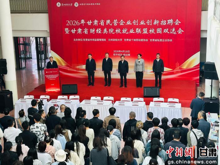 中新网甘肃新闻4月18日电 由甘肃省市场监督管理局、兰州财经大学、甘肃省个体劳动者协会与私营企业协会联合主办的,2026年甘肃省民营企业创业创新招聘会暨甘肃省财经类院校就业联盟校园双选会,18日在兰州财经大学如期启幕。
